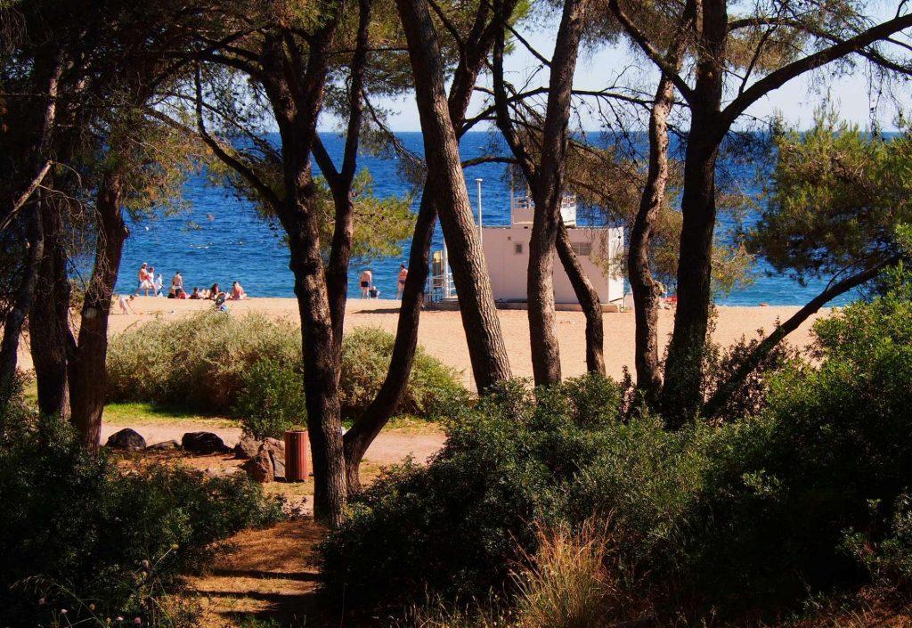 Was uns auch gut gefällt, ist die Möglichkeit, im Schatten sitzen zu können. Es gibt genug Strandkiefern, unter denen man sich vor der Sonne schützen kann. Auch die Picknicktische darunter nutzen wir gerne für unsere Mahlzeiten. Wir erfreuen uns auch an den Großfamilien oder Seniorengruppen am Wochenende. Die treffen sich hier zum gemeinsamen Essen, Wein trinken und Boule spielen in fröhlicher Runde.